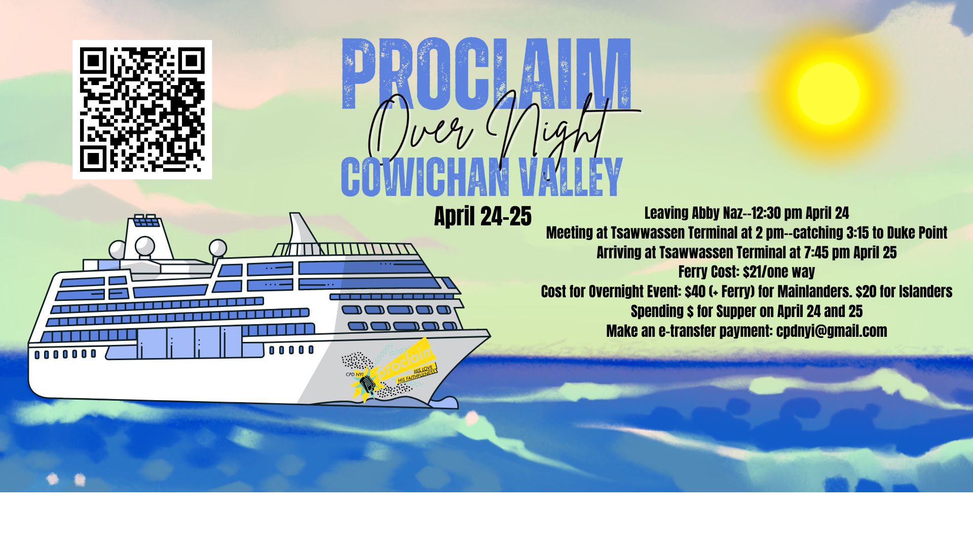 Pick Up: From Ferry Terminal at 7:45 pm, Saturday, April 25. Travelling by Bus to Abbotsford Church of the Nazarene and arriving at 8:45 pm Saturday, April 25